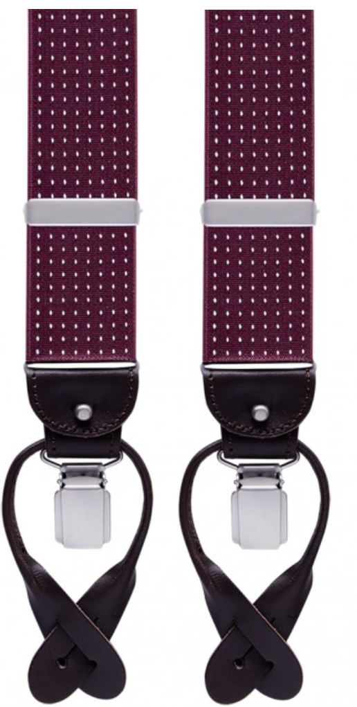 Luxurious, burgundy red braces with white dots by Profuomo. Equipped with burgundy and white dotted straps, silver colored clips/adjusters and dark brown leather.