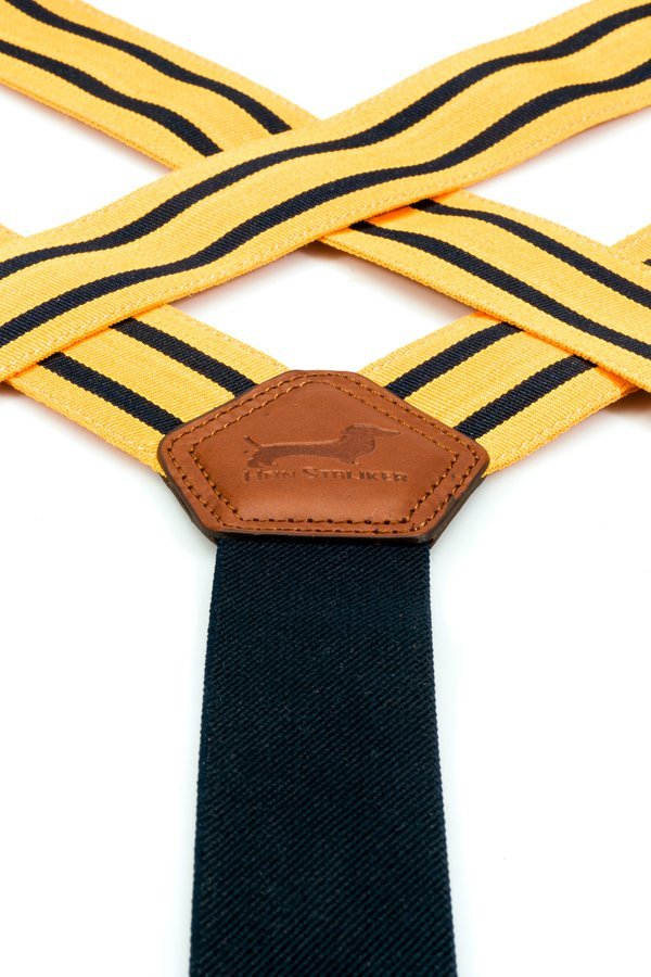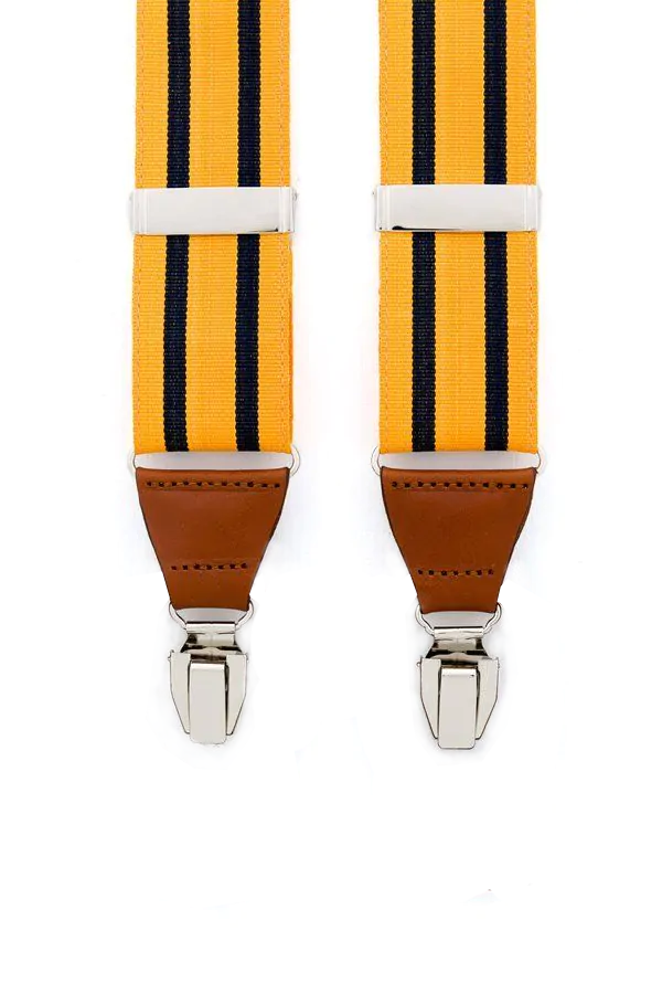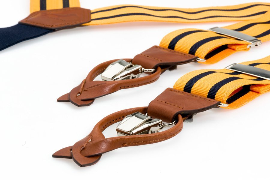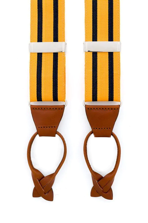 Yellow and blue striped braces with luxurious leather finish in cognac brown