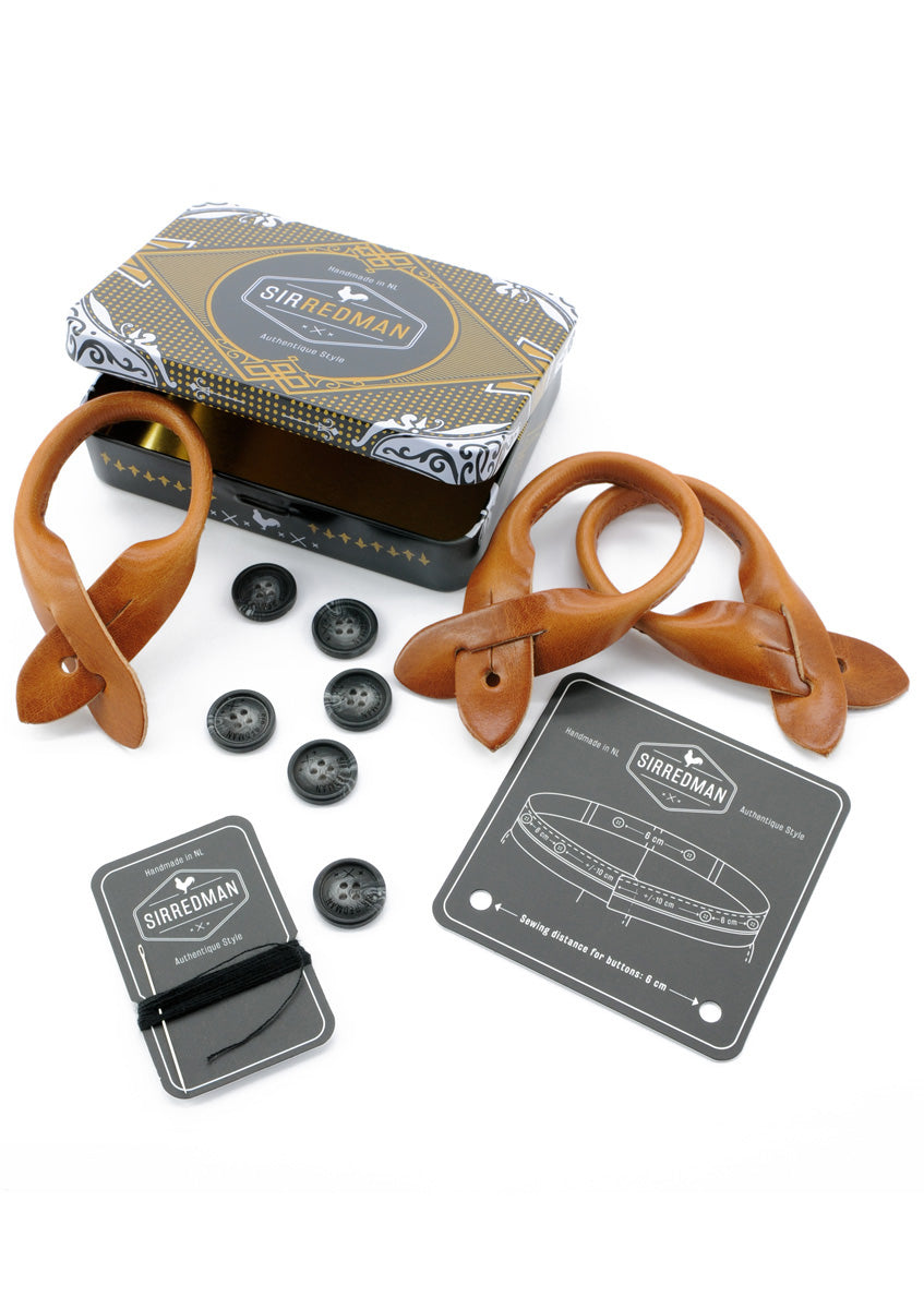 Sir Redman makes his braces completely by hand in-house. These braces are equipped with the best quality leather loops and sturdy clips. They are also adjustable in size with sliding clamps. With the special supplied tin with 6 buttons, needle & thread and a distance determiner to attach the buttons to the inside of your trousers, it is very easy to wear your braces in the authentic way. Are you not that into that? Then use the high-quality clips to clamp them to your trouser waistband. They are removable from each other. Do you not use the loops? Then store them in the tin: handy, right?