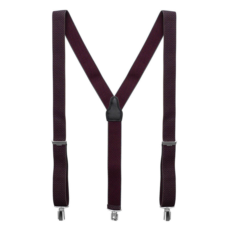 Bretelles rouges de la marque Daspartout avec motif anthracite et dos noir. Avec trois clips, donc deux clips à l'avant et un à l'arrière pour attacher les bretelles au pantalon. Les bretelles ont une largeur de 3,5 cm et une longueur totale de 120 cm. Les clips sont de qualité solide.