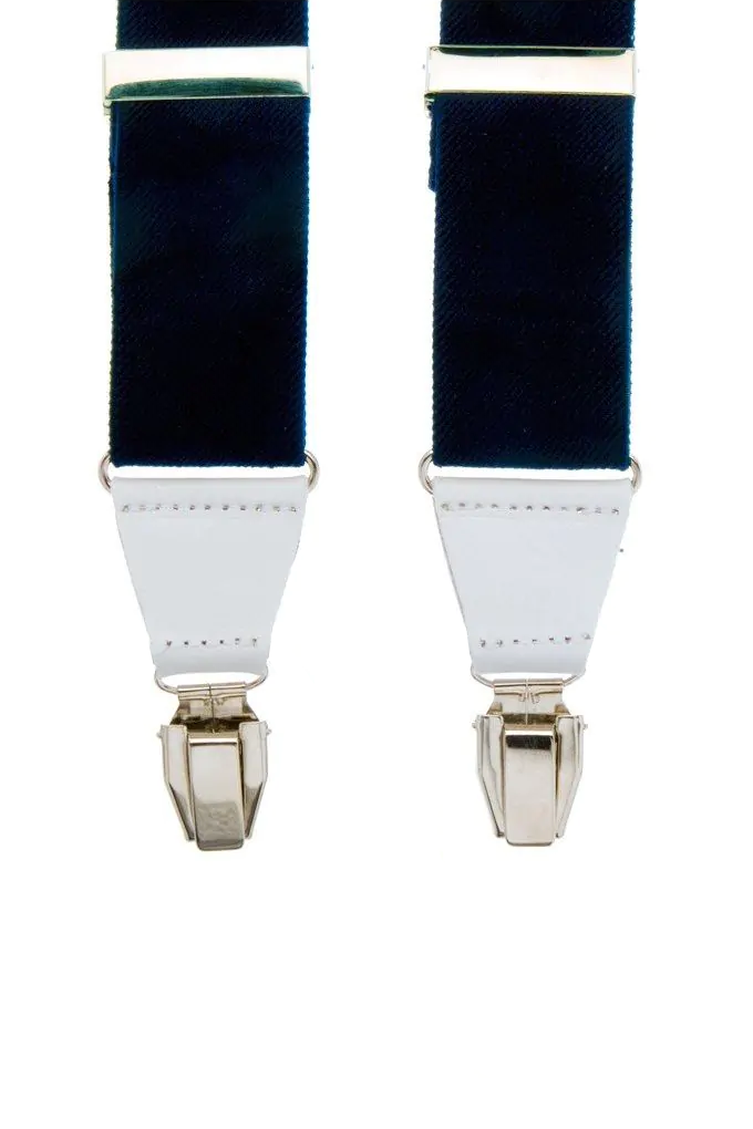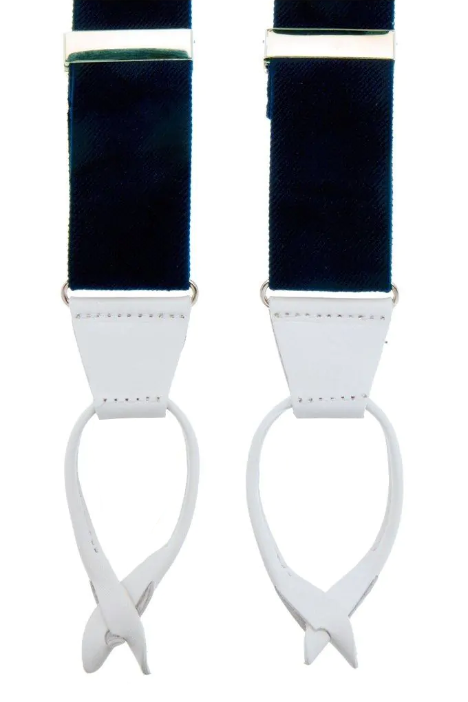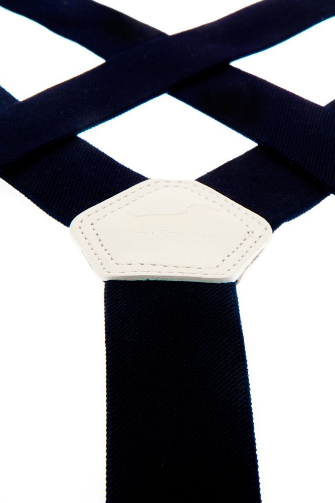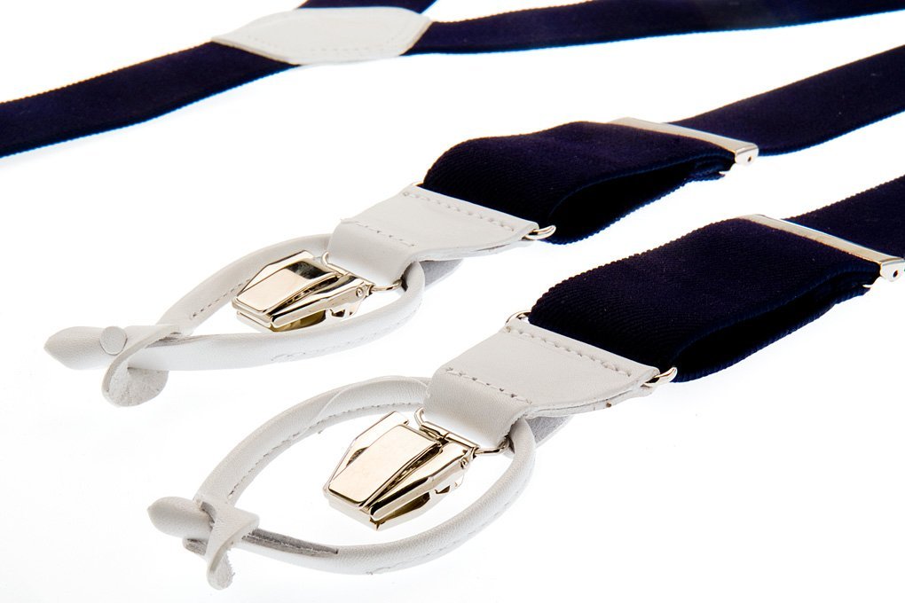 Bretelles bleu foncé avec sangles élastiques en toile et finition en cuir luxueux en blanc