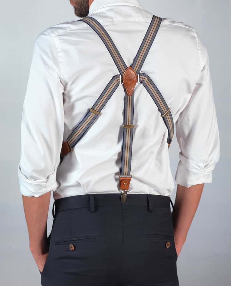 De bretels zijn uitgevoerd in bruine, leren banden en grijs - lichtbruin gestreept elastiek op de rug. Ideaal te combineren met een wit of blauw overhemd en bruine schoenen. Andere kleuren, combinaties of sneakers zijn natuurlijk ook mogelijk.