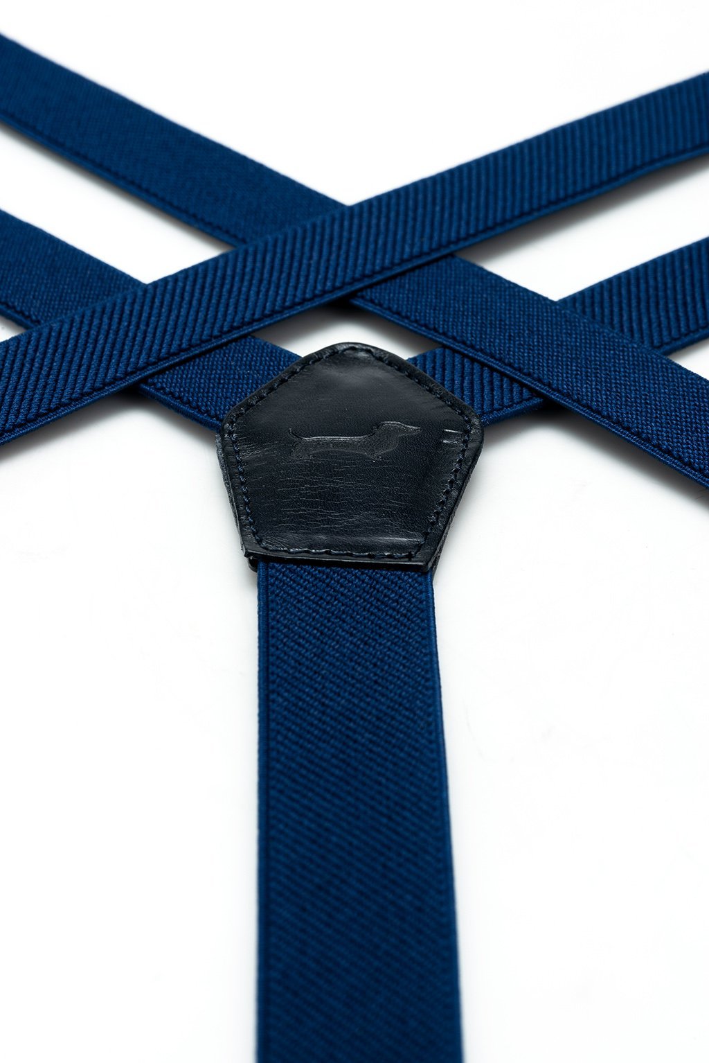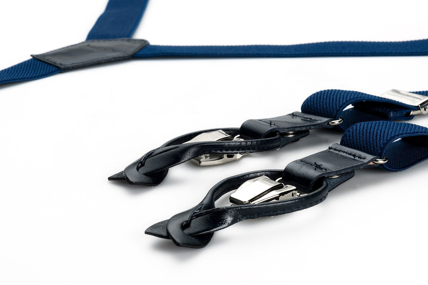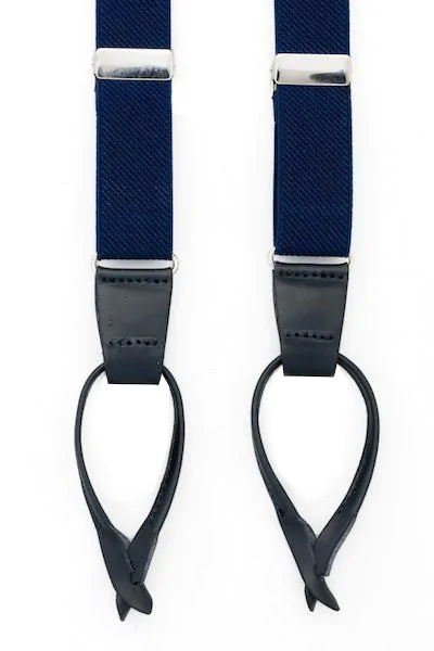 Blauwe bretels van topkwaliteit (Y-vorm, 117 cm lang en 2,5 cm breed), afgewerkt in luxe uitvoering met lussen en tussenstukken van blauw leer. De band van de bretels aan rugzijde is van elastisch canvas voor optimaal draagcomfort.