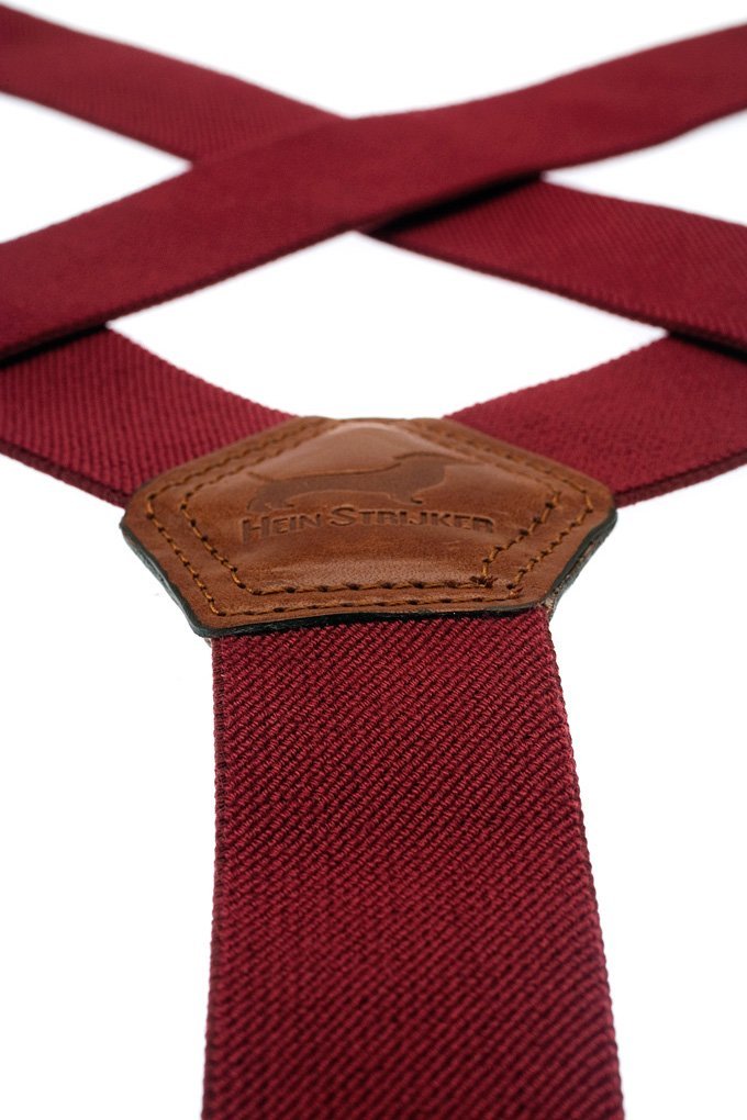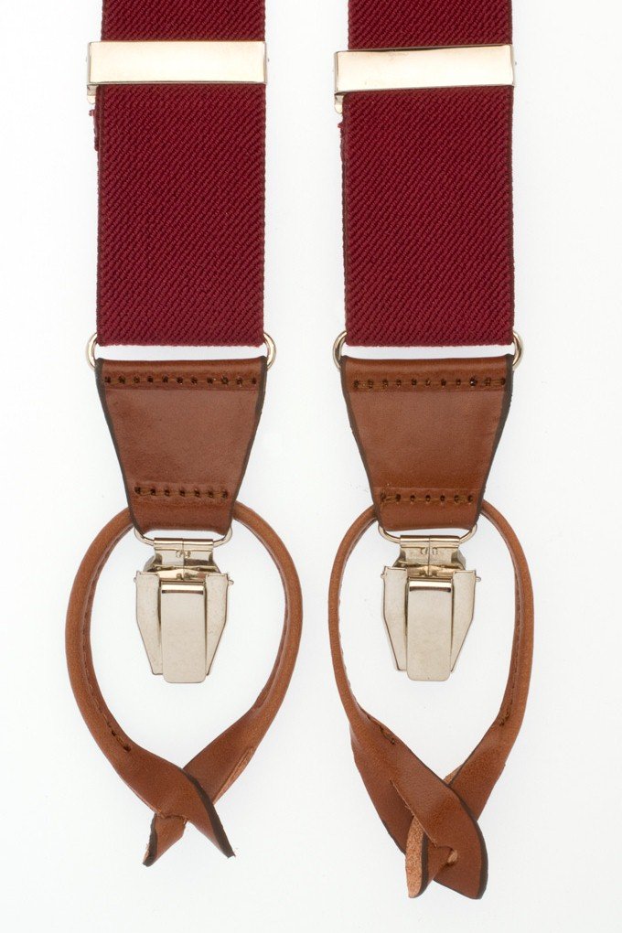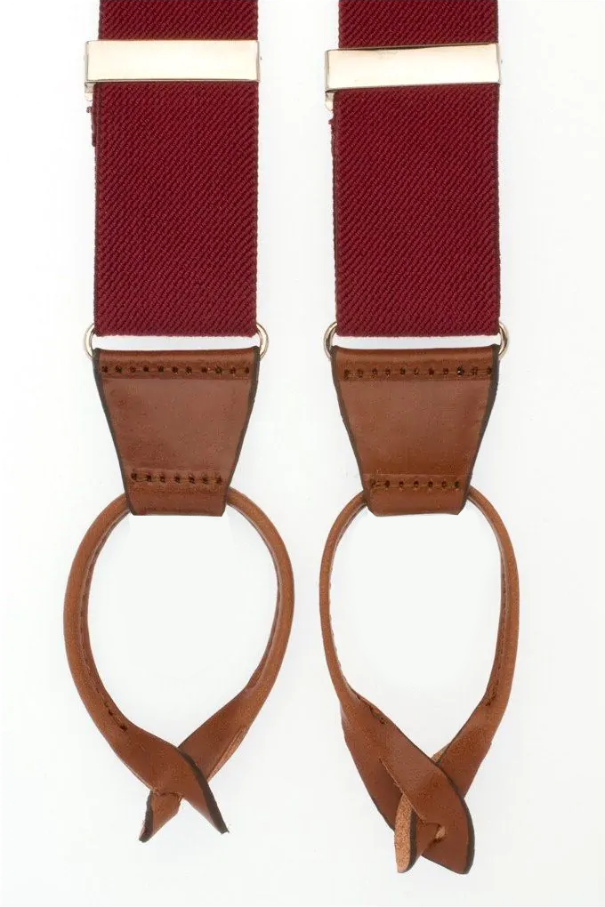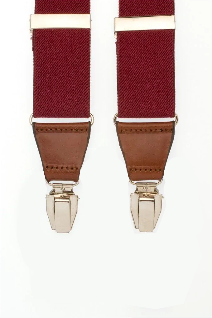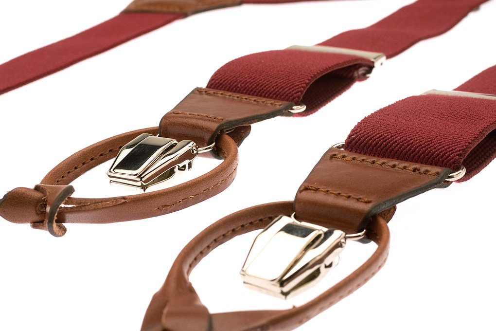 Bordeaux rode bretels met banden van elastisch canvas en luxe leren afwerking in de kleur cognac bruin