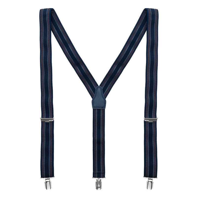 Blauwe bretels van het merk Daspartout met lichtblauw patroon en blauw rugstuk. Met drie clips, dus twee clips aan de voorzijde en een aan achterzijde om de bretels mee aan de broek te bevestigen. De bretels hebben een breedte van 3,5 cm en een totale lengte van 120 cm. De clips zijn van solide kwaliteit.