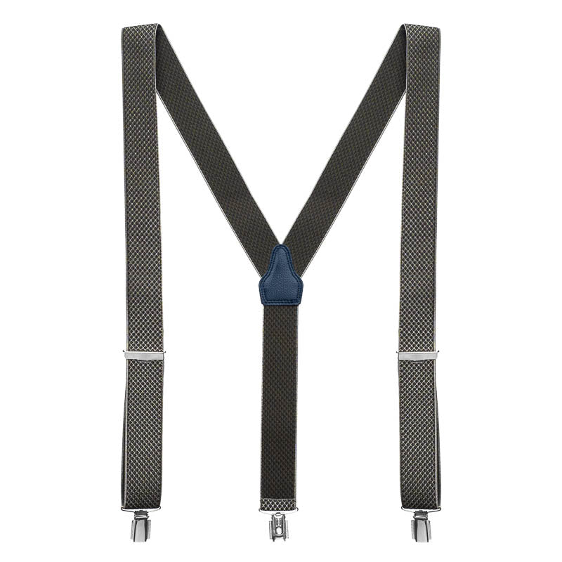 Groene bretels van het merk Daspartout met antraciet patroon en zwart rugstuk. Met drie clips, dus twee clips aan de voorzijde en een aan achterzijde om de bretels mee aan de broek te bevestigen. De bretels hebben een breedte van 3,5 cm en een totale lengte van 120 cm. De clips zijn van solide kwaliteit.