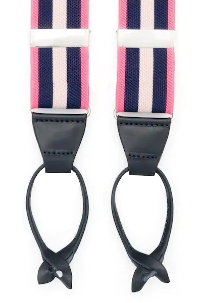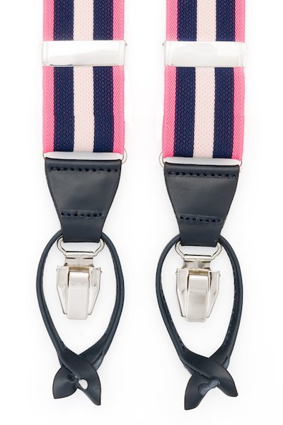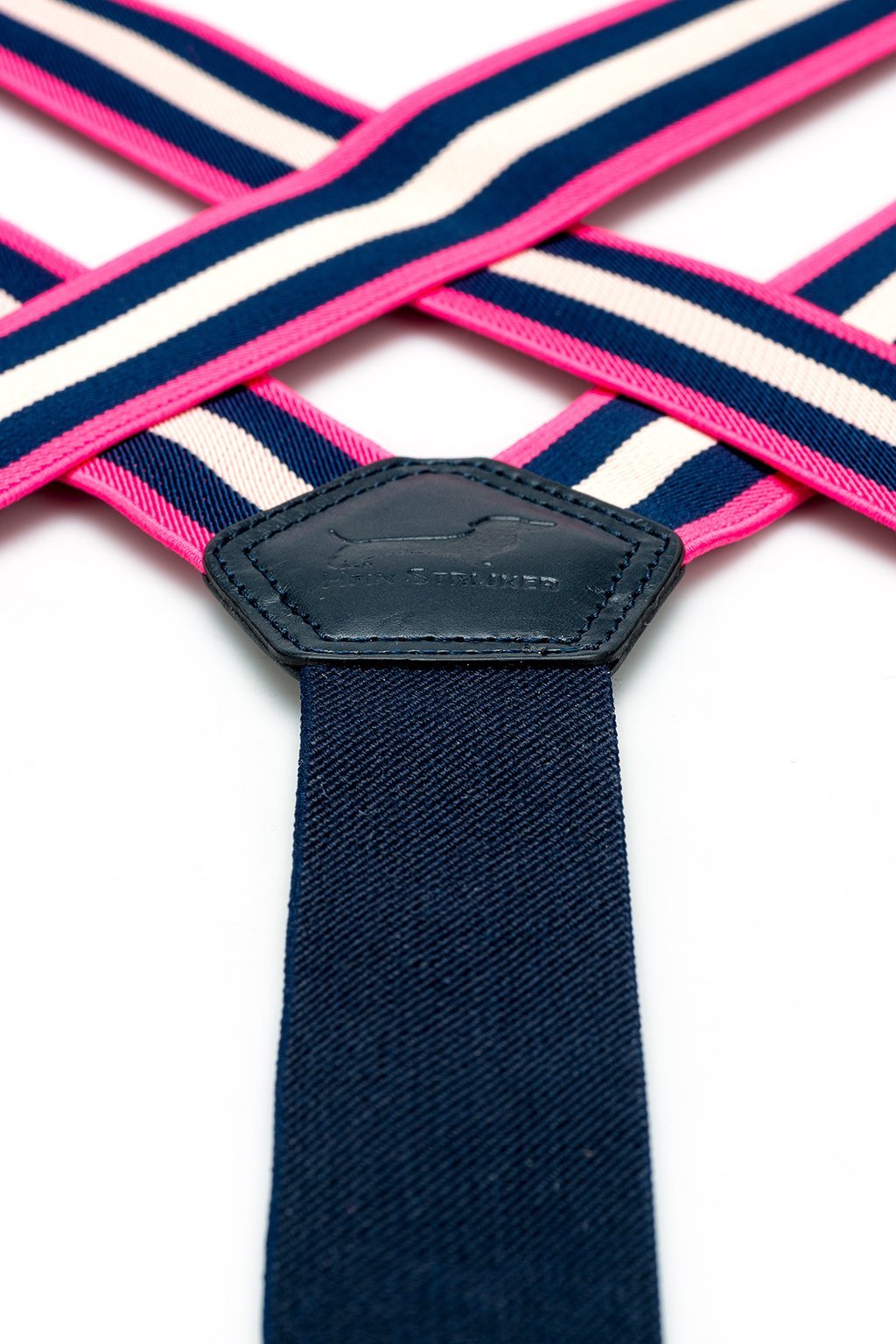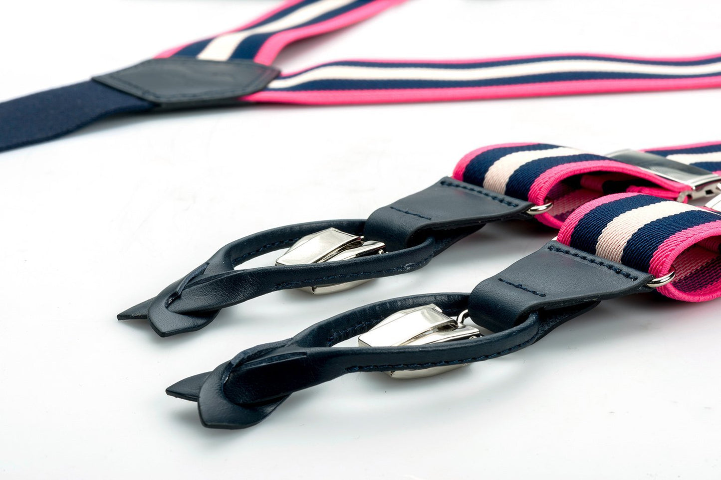 Blauw met roze gestreepte bretels van topkwaliteit (Y-vorm, 117 cm lang en 3,5 cm breed), afgewerkt in luxe uitvoering met lussen en tussenstukken van donkerblauw leer. De band van de bretels aan rugzijde is van elastisch canvas voor optimaal draagcomfort.